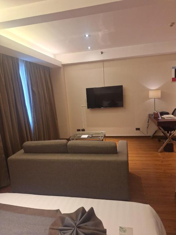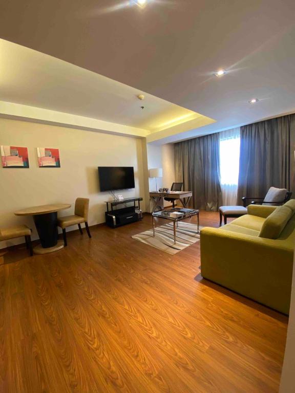 Our stay was great! The room was spacious, clean, and fully equipped with everything we needed. I especially loved that there were two televisions, one in the living area and another in the bedroom, as well as a convertible sofa bed. This room is ideal for families or groups. The hotel staff were kind and attentive. However, the front desk at the water spa didn’t provide us with towels upon entry. We only found out that towels should be given to hotel guests when we asked for one. So make sure to request your towel when they hand you the tray and swimming caps. There are times especially on weekends when the pool, locker room, and shower areas get crowded. Although the facilities are a bit dated, all of the hydrotherapy amenities were functioning well and served their purpose. If you're bringing kids, I recommend letting them wear their own swimming caps so you can easily spot them when the pool area gets busy. The lighting at the water spa is also quite dim, I hope they can improve it to create a brighter ambiance. We enjoyed our dinner at the Sky High Bar. Aside from the stunning city lights view, all the dishes we ordered were delicious and came in generous portions. The staff there were attentive as well. Just take note that some of the tables have a consumable minimum. As for the breakfast buffet, the area is quite small. We went between 6–7 AM and it wasn’t crowded at that time. The food selection was typical of a breakfast buffet, simple but satisfying. Overall, we truly enjoyed our stay and would recommend this hotel if you're looking for a different kind of staycation experience. The water spa is perfect for adults who want to try a unique and relaxing spa treatment.