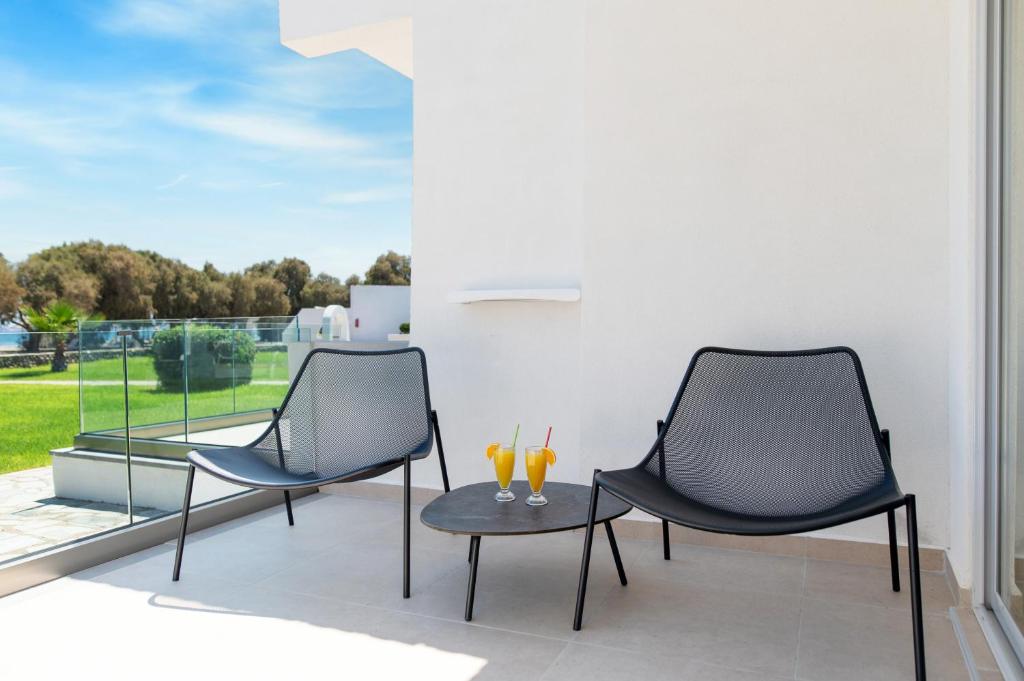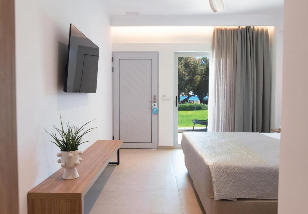 Admire breathtaking views of the sparkling Aegean Sea from the Beachfront Sea View Suite, a spacious 48 square meter haven featuring a plush King Bed. For panoramic vistas of the island, the Deluxe Double Room Panorama offers 32 square meters of elegance, complete with a cozy Double Bed.